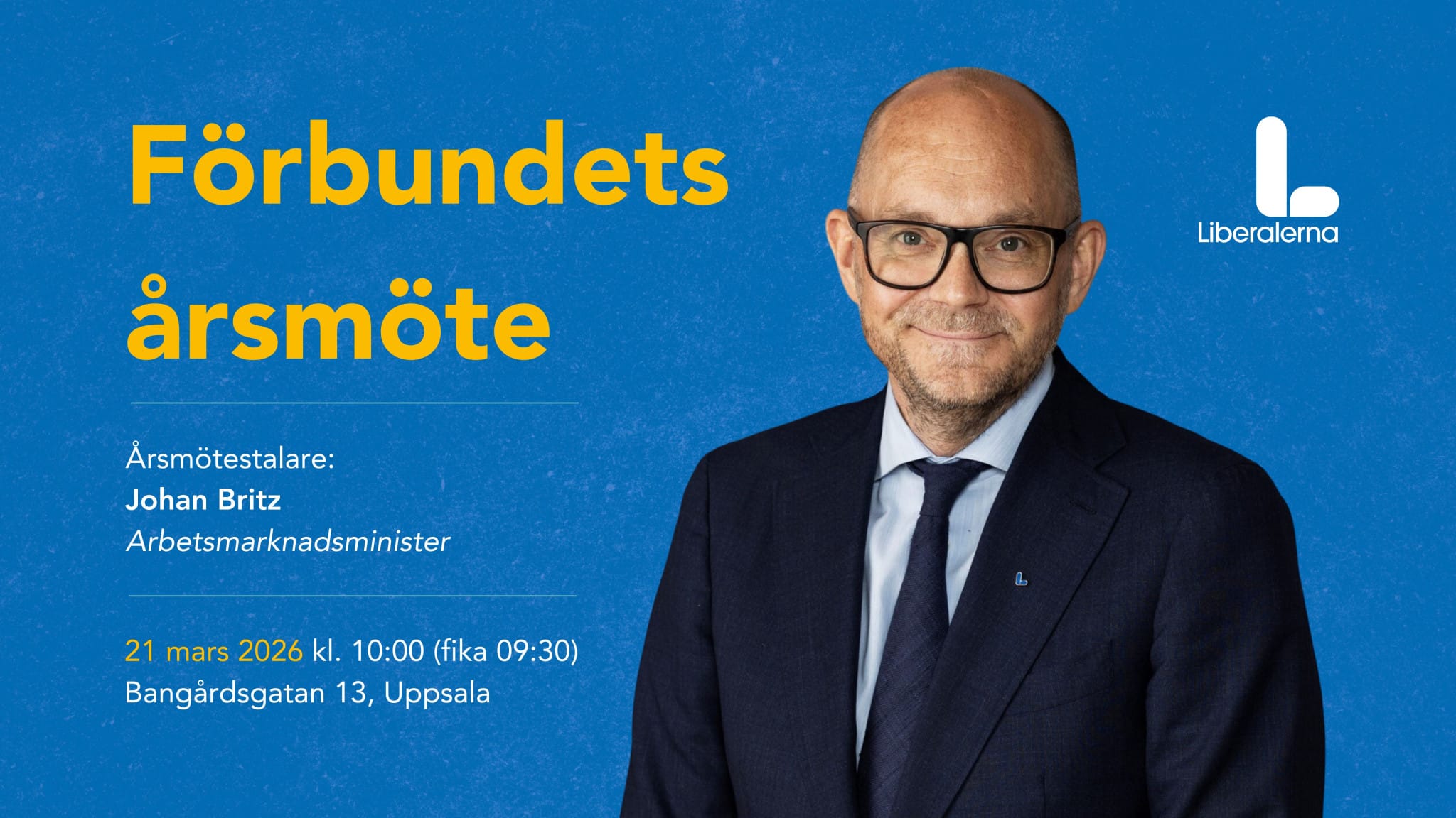 Varmt välkommen till Liberalerna Uppsala läns förbundsårsmöte 2026. Årsmötestalare är arbetsmarknadsminister Johan Britz. Alla medlemmar är välkomna!
